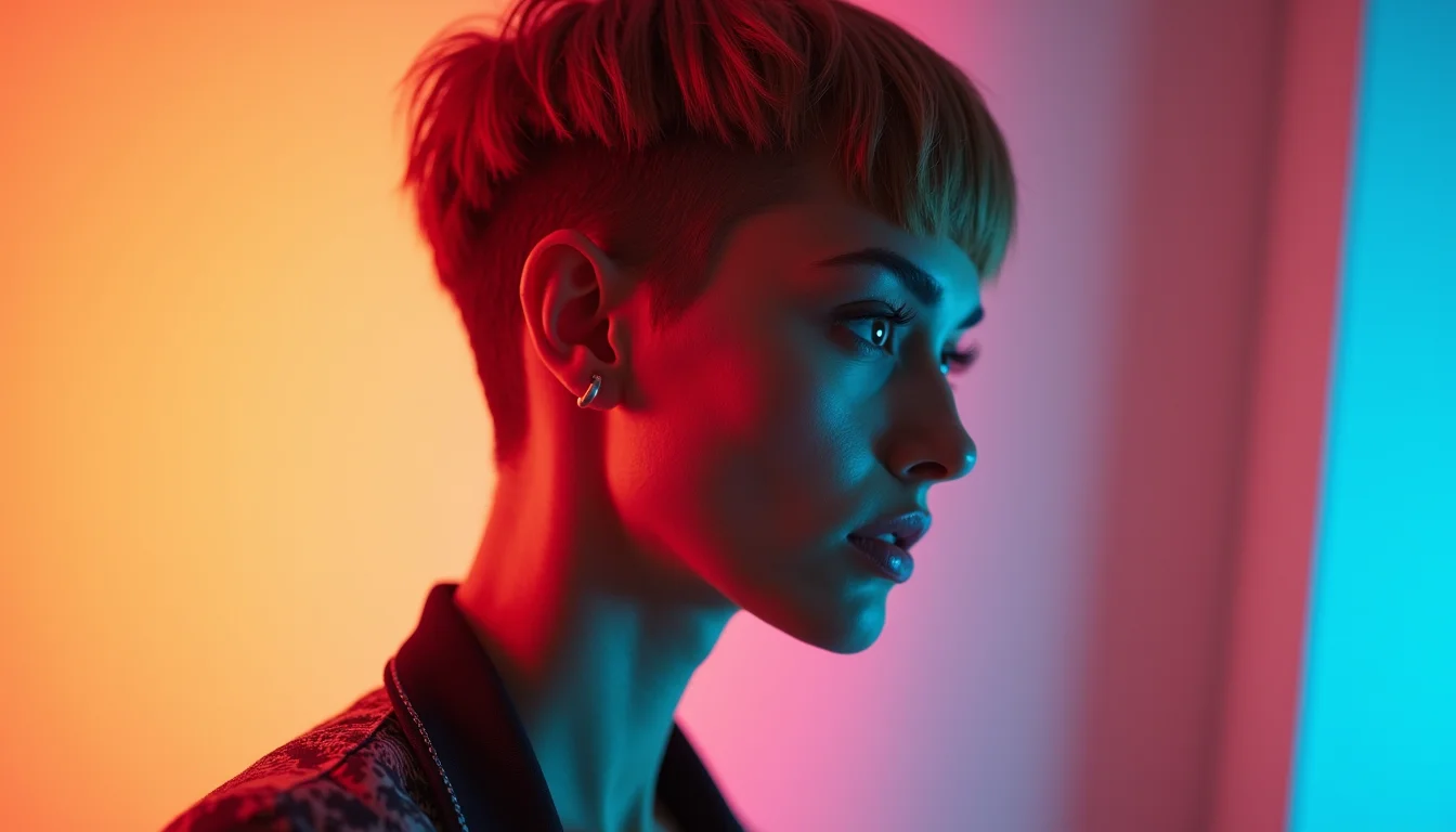 Pixie cut assimétrico com mechas loiras claras, fios texturizados no topo, nuca raspada com degradê suave, iluminação frontal intensa.