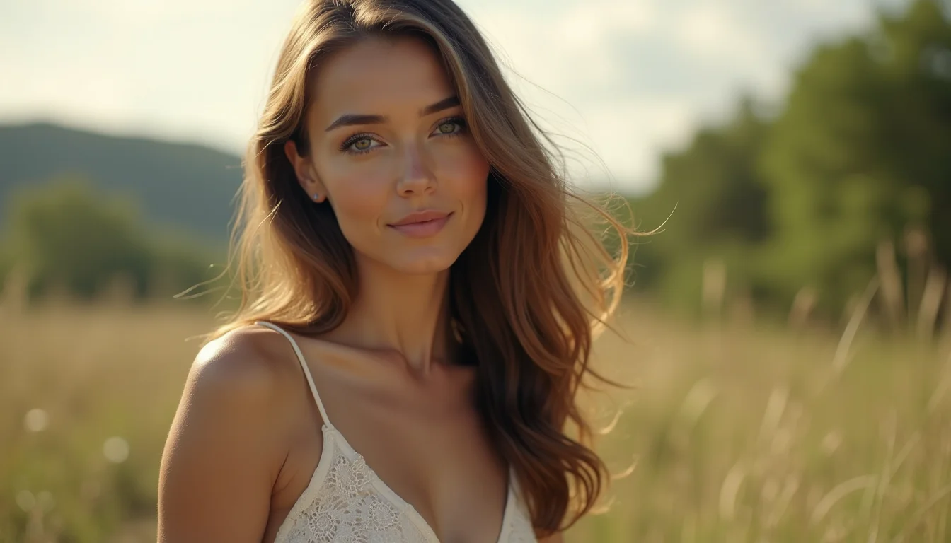 Cabelo castanho médio, com reflexos acobreados, em um penteado semi-preso que revela o comprimento até a cintura, com textura natural.