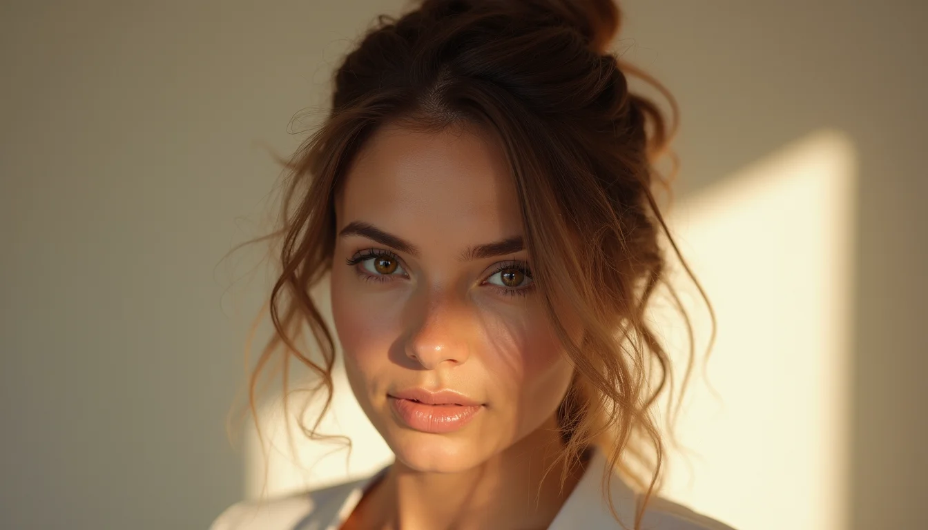 Penteado coque alto despojado com mechas finas caindo sobre o rosto, cabelo castanho médio, fundo de parede texturizada.