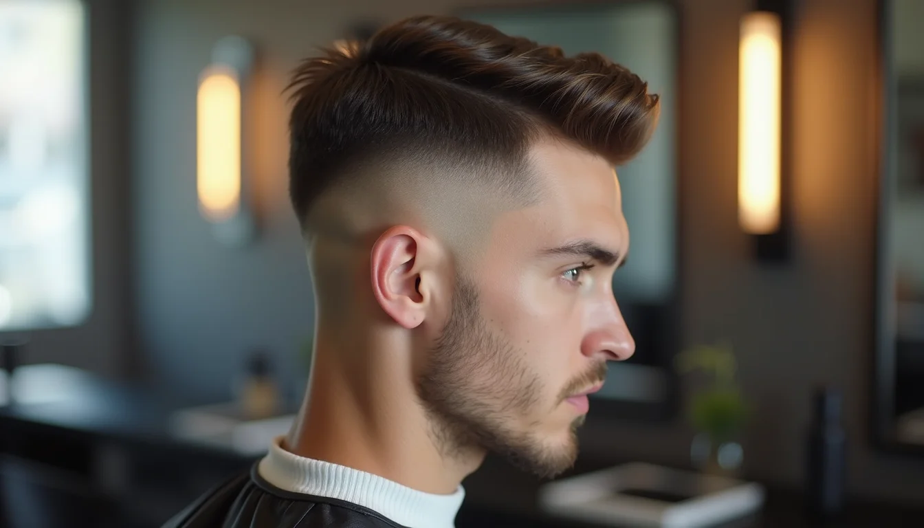 Detalhe de um corte fade masculino moderno, mostrando a linha de transição nítida entre a pele e os fios curtos na lateral.