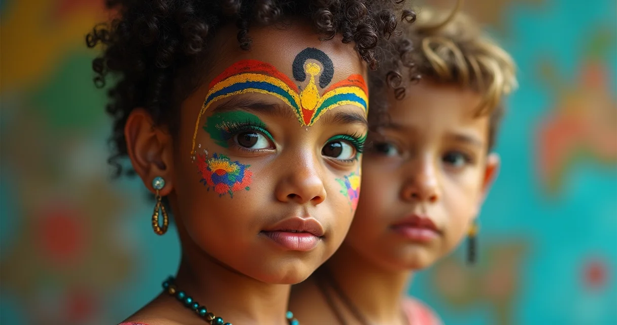 A beleza indígena masculina se expressa não só no cabelo, mas também em bigodes e pinturas faciais, criando um visual completo.