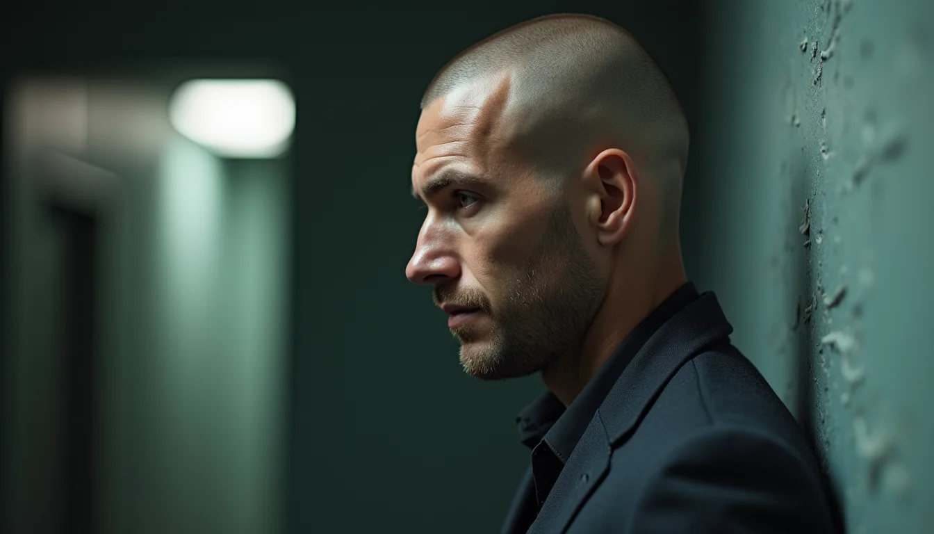 Homem com cabelo raspado 0, olhando diretamente para a câmera, com um fundo de parede branca lisa, onde a ausência de cabelo é o ponto focal principal.
