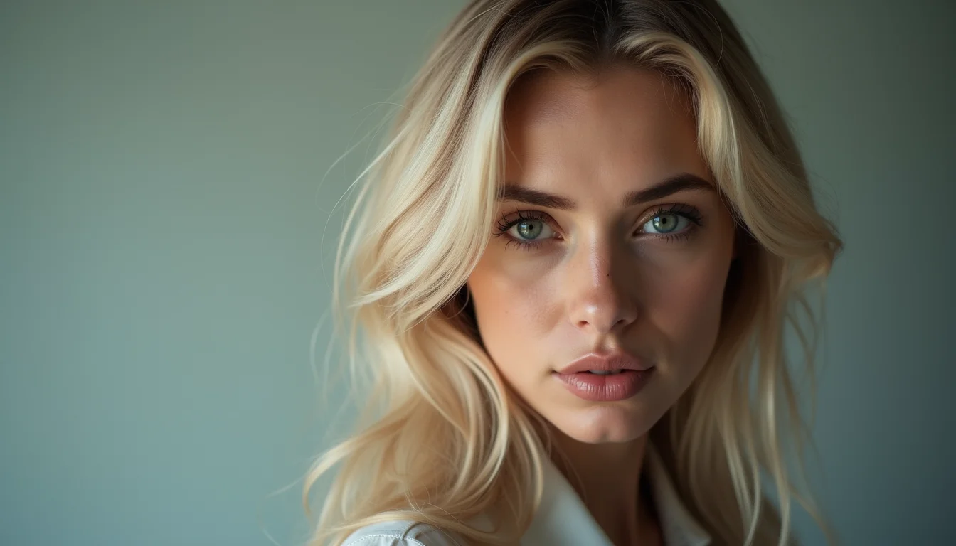Mulher com cabelo loiro acinzentado em tom platinado, com textura levemente desfiada nas pontas, em pose frontal com iluminação de estúdio.