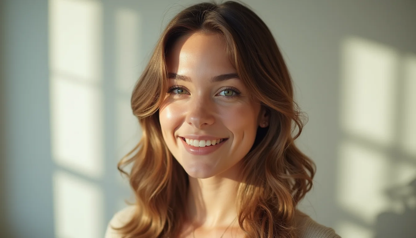 Cabelos castanhos médios com ondas suaves, iluminados por uma luz de janela, mostrando a uniformidade da cor e a ausência de pontas duplas.