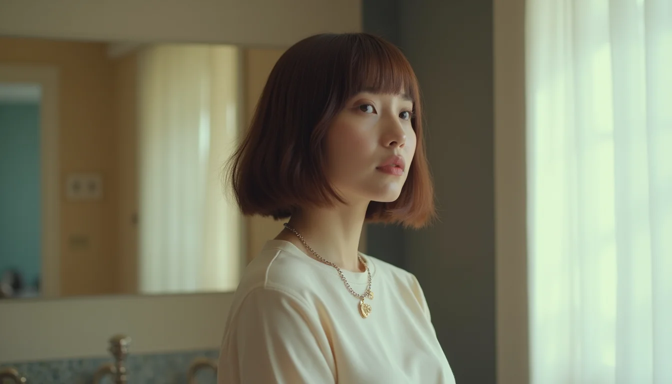 Um long bob com franja cortininha, mostrando a separação natural dos fios e o caimento suave, em um ambiente com luz difusa.