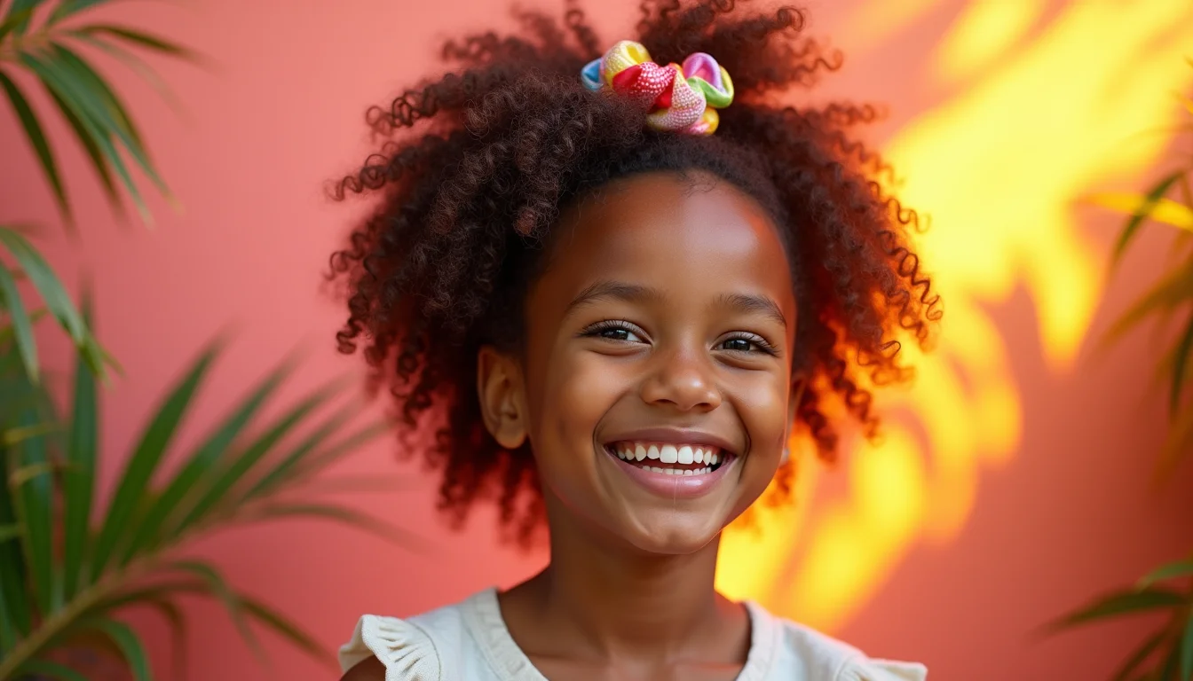 Adicionar um laço colorido ou uma tiara estampada ao afro puff transforma o look básico em algo super especial. Explore cores vibrantes que combinem com a personalidade da criança.