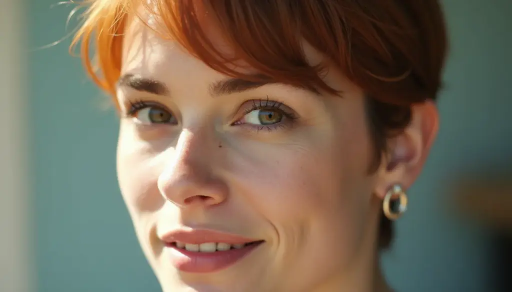 Penteado semipreso com torção e um pequeno adorno de flor discreta em cabelo curto ruivo, com foco na textura natural dos fios.